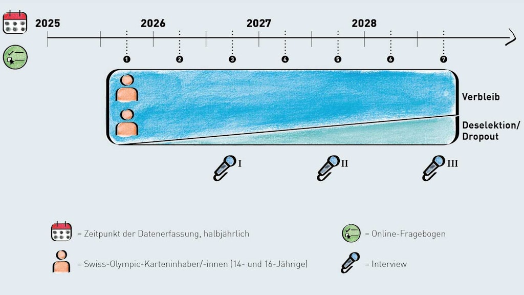 Ab Sommer 2025 begleiten die Forschenden alle Swiss-Olympic-Cardholder der Jahrgänge 2008 und 2010 über drei Jahre. Zwei Mal pro Jahr werden Veränderungen mit kurzen Online-Fragebögen erfasst. Zusätzlich werden Jugendliche interviewt, die aus dem Sportsystem ausscheiden. Daraus werden konkrete Unterstützungsangebote und Präventionsstrategien entwickelt.