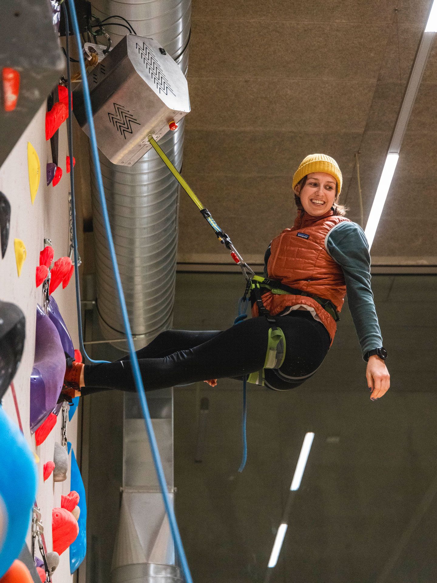 Der eClimber ist ein Gerät, das eine kletternde Person aktiv mithilfe einer einstellbaren Gewichtsentlastung sichert und unterstützt – wie ein E-Bike fürs Klettern. Studierende und Mitarbeitende der Berner Hochschullandschaft hatten Gelegenheit, das zum Patent angemeldete Selbstsicherungsgerät in der Kletterwand zu testen.