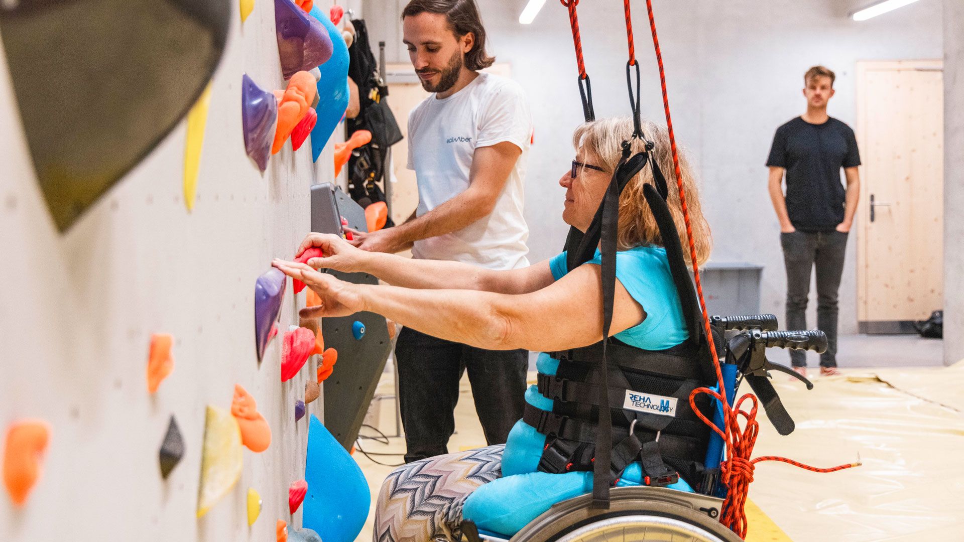 Der Kletternachmittag diente dazu, das Gerät im Einsatz mit Menschen mit und ohne Beeinträchtigungen zu testen und weitere Erfahrungen damit zu sammeln. Harry Sonderegger, Studiengangleiter Sportkoordination und Kletterspezialist der EHSM, stand dem anwesenden Projektteam mit Rat und Tat zur Seite und unterstützte die Teilnehmenden beim Klettern. Ziel ist es, den eClimber zu einem marktreifen Produkt zu entwickeln.
