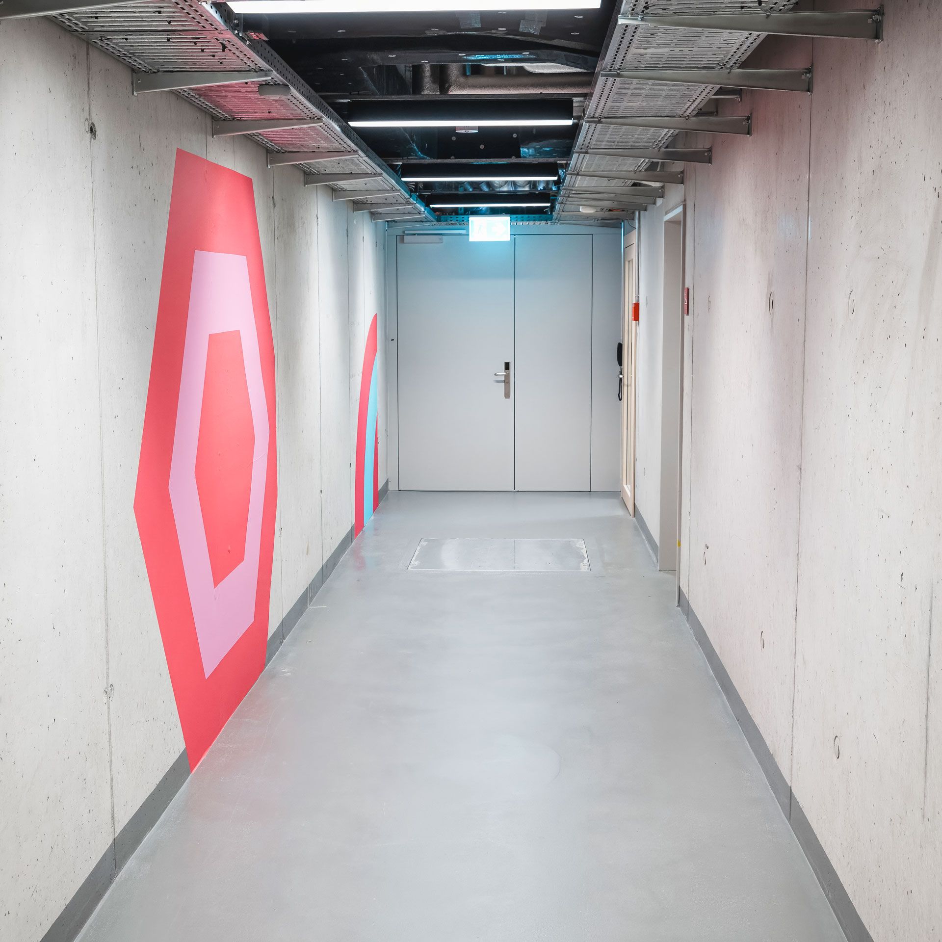 Geometrische Formen setzten da Akzente, wo viele Mitarbeitende die Garderobe vor und nach der körperlichen Ertüchtigung aufsuchen. Was vormals den Charme eines Zivilschutzkorridors innehatte, wird durch die bunte Grafik zu einem gestalteten Ort.