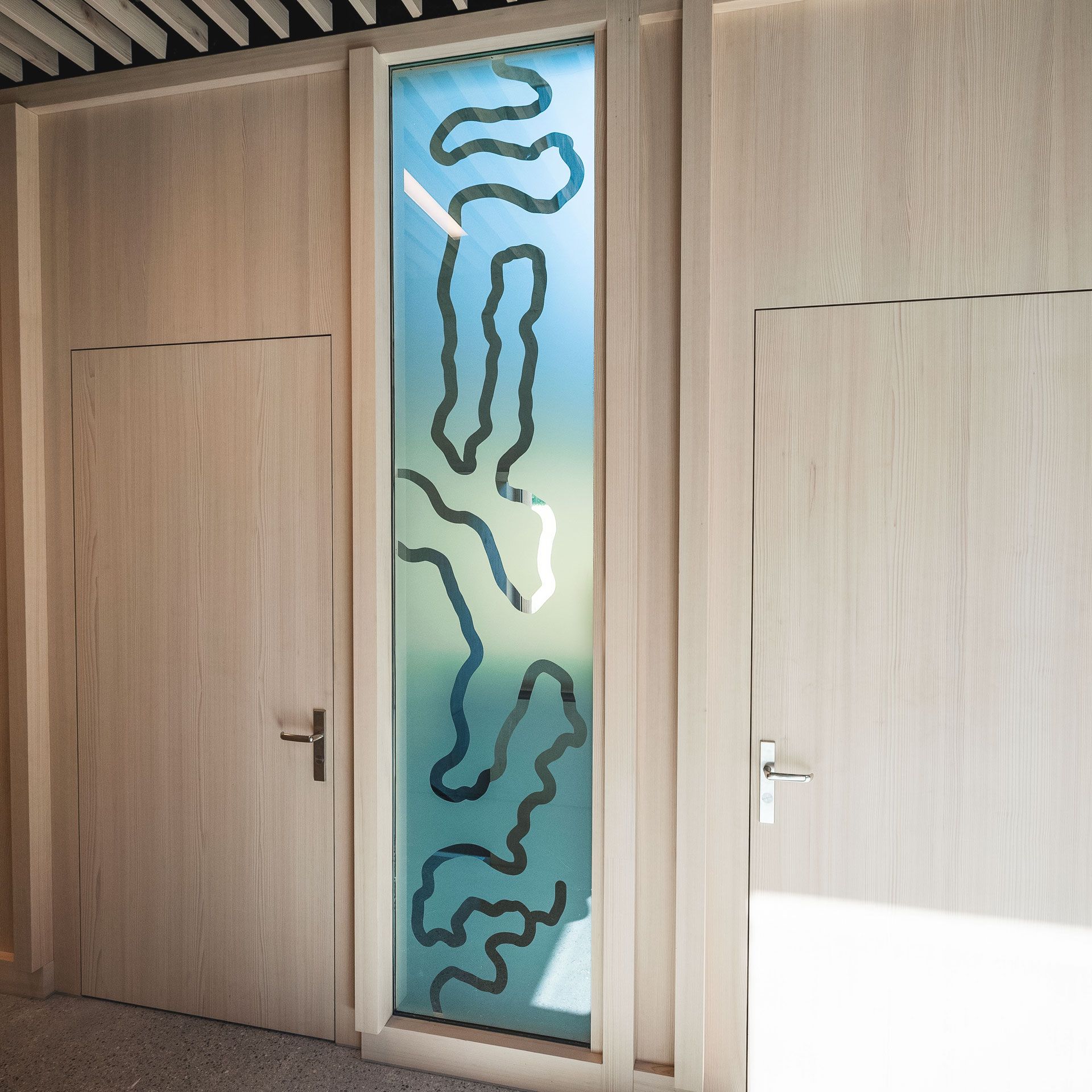 Ein einziger Einblick ins Treppenhaus ist nur noch durch eine kurvig mäandrierende Zeichnung möglich. Auf der opaken Oberfläche erscheint die Zeichnung wie ein Maulwurfsgang.