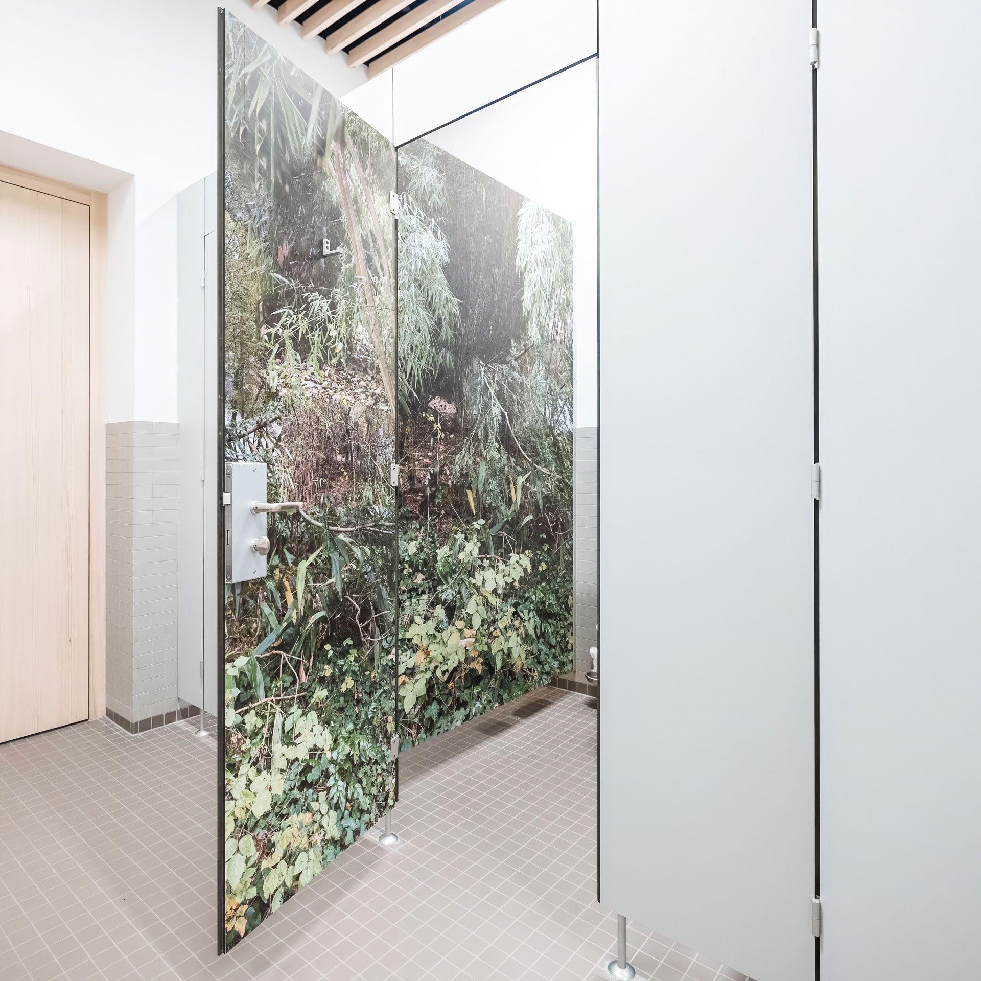 Fabia Kunz bereichert einen funktionellen, rein pragmatisch ausgerichteten Ort. Mitten im grauen Beton findet sich eine grüne Oase: Eine einzige WC-Kabine verwandelt die sterile Umgebung in einen üppigen Naturraum.