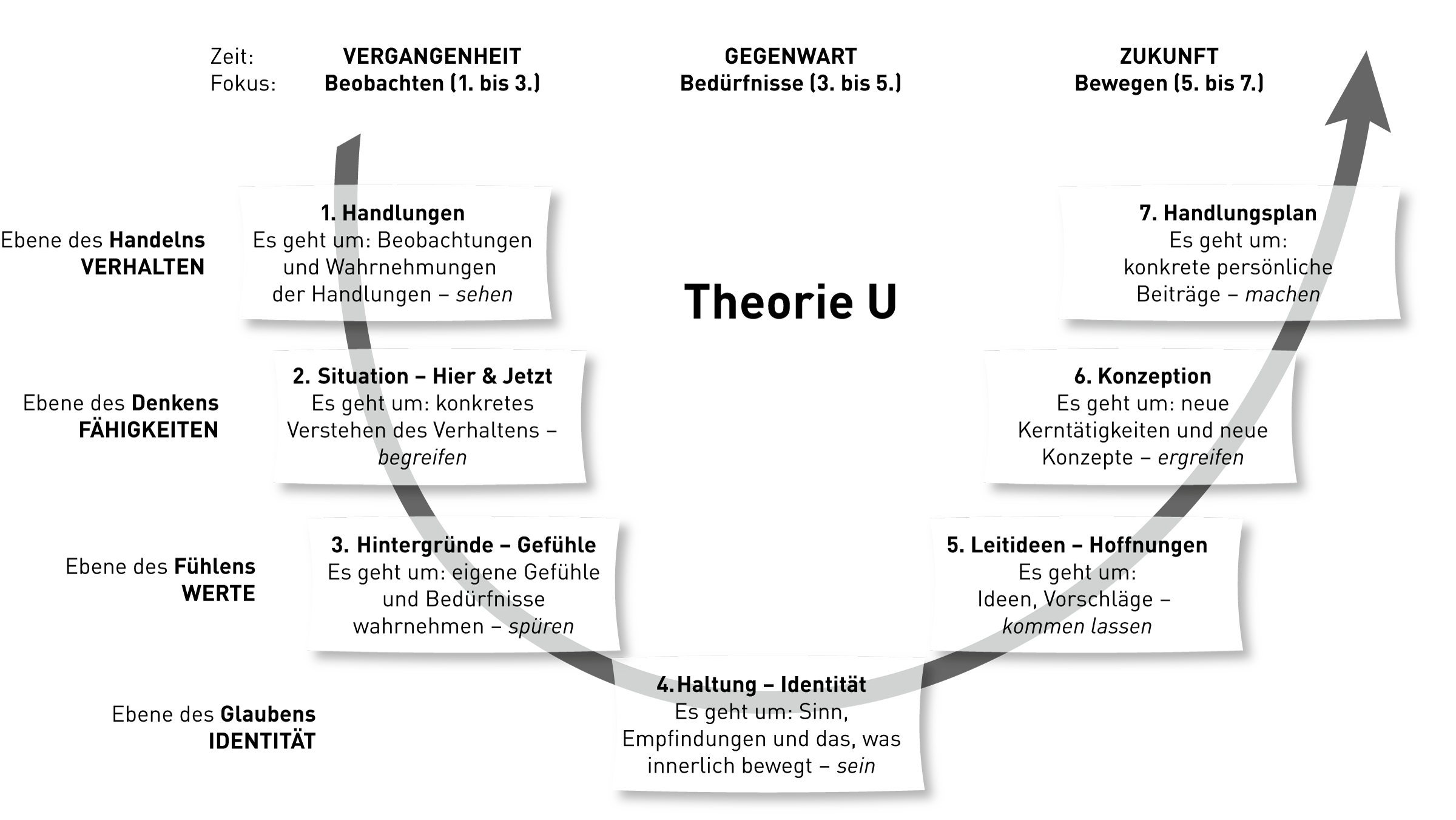 Das Modell des U-Prozesses (nach Claus Otto Scharmer, Friedmann Schulz von Thun und Robert Dilts) besteht aus vier Ebenen, drei Blickrichtungen und sieben Schritten.