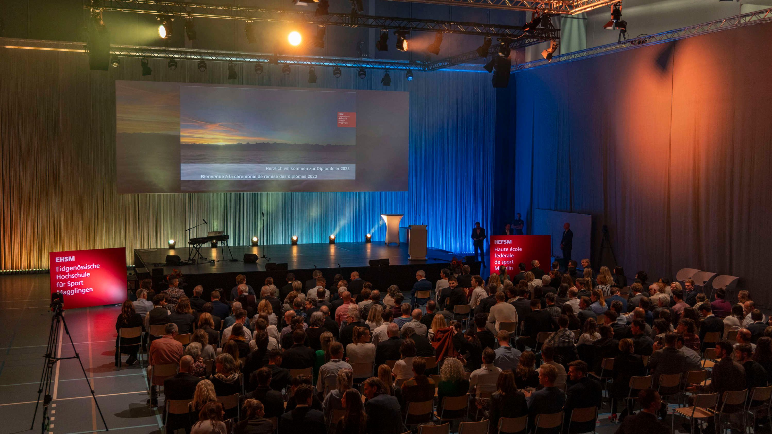 Es ist ein spezieller Moment in einem speziellen Ambiente, wenn die frisch diplomierten Studienabgängerinnen und -abgänger der EHSM in der Sport-Toto-Halle mit ihren Angehörigen den erfolgreichen Studienabschluss feiern. Wenig erinnert in diesem Moment an eine Sporthalle, an den Schweiss und die Anstrengungen, die ihnen das Studium in Magglingen abverlangte. Die Protagonistinnen und Protagonisten machen, in Samt und Seide gekleidet, eine gute Figur, die extra eingerichtete Bühne leuchtet in satten Farben. Gewohnt routiniert führen Carolina Oggenfuss, Leiterin des Bachelor-Studiengangs, und Urs Rüdisühli, Leiter Ausbildung, durch den Abend.
