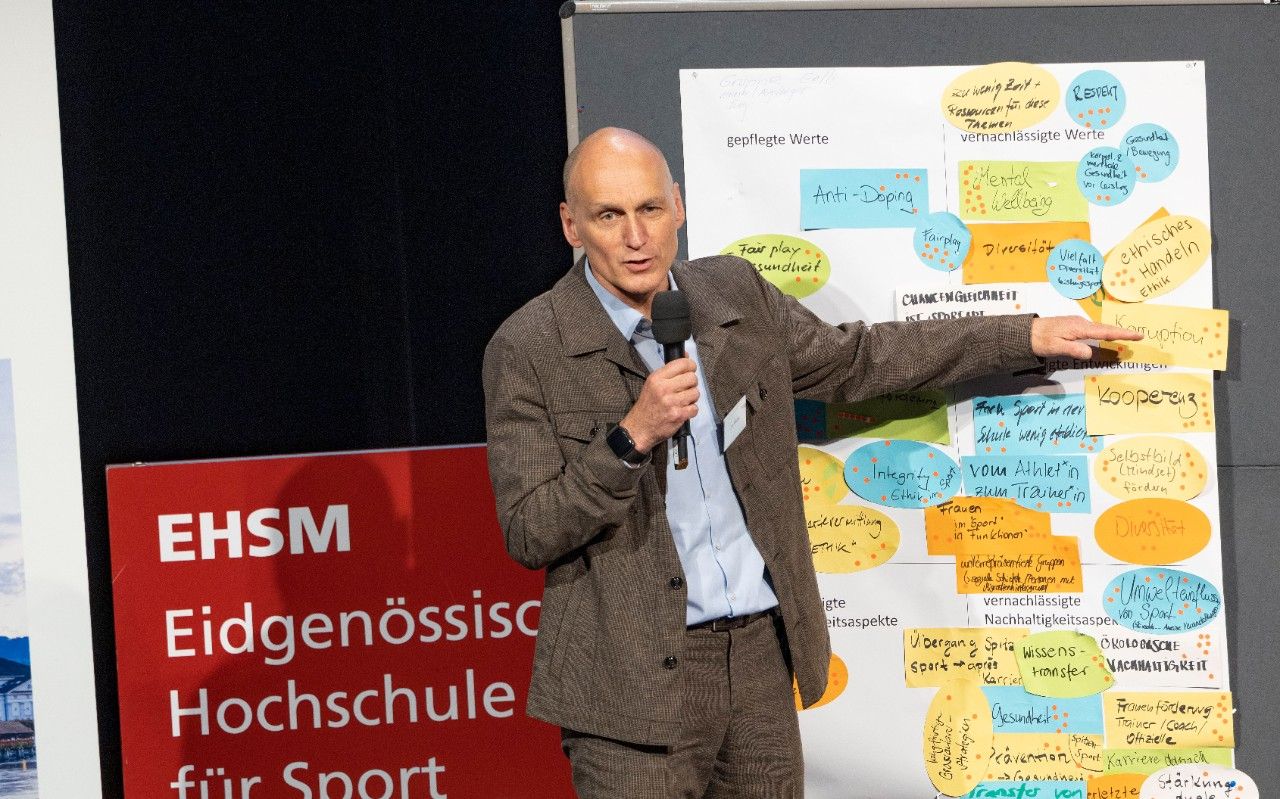 L'utilité et la durabilité de certains projets sportifs ont été présentées à l'aide d'exemples véridiques, notamment les championnats d'Europe d'athlétisme 2014 à Zurich et le lancement de l'UBS Kids-Cup. A l'issue de ces exposés, les participants et participantes se sont attelés à une réflexion concrète dans le cadre de deux ateliers. Ils ont ainsi, d'une part, dressé un tour d'horizon de la situation actuelle à propos de l'ancrage des valeurs dans le système du sport suisse et, d'autre part, envisagé les mesures possibles pour améliorer ce transfert de valeurs. La table ronde finale, animée par le précédent recteur de la HEFSM, Walter Mengisen, a réuni un panel d'experts: Matthias Remund, le directeur de l'Office fédéral du sport OFSPO, Roger Schnegg, le directeur de Swiss Olympic, Camille Balanche, sportive multitalents et championne du monde de VTT de descente, et Marisa Reich, fondatrice de She Sports Switzerland. Tous se sont montrés conscients de l'importance croissante du sport dans la société et de leur responsabilité quant aux défis qui en résultent.