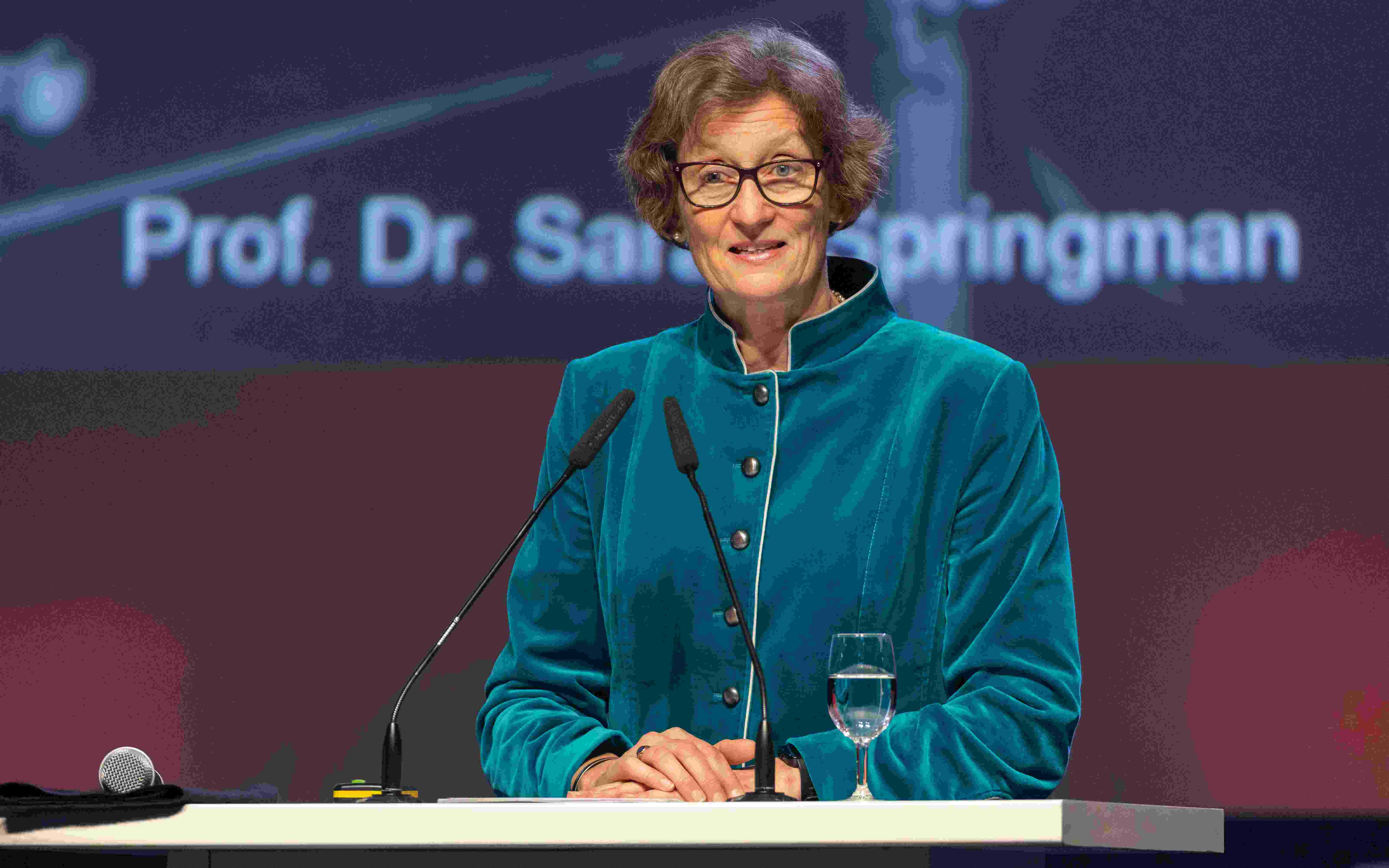 La professeure Sarah Springman, rectrice de l'EPF Zurich, élevée notamment au rang d'officier de l'Ordre de l'Empire britannique pour les services rendus à la fédération britannique de triathlon, a impressionné l'auditoire presque autant par son discours que par son palmarès, passant en revue les différentes étapes de ses carrières professionnelle et sportive hors du commun. Elle est ainsi revenue sur une compétition dans laquelle elle s'était illustrée alors qu'elle était triathlète: au sein d'une équipe 100% féminine, elle a relié Londres à Paris en traversant la Manche, surclassant même les Royal Marines, ce qu'elle a fait remarquer non sans un brin de fierté.