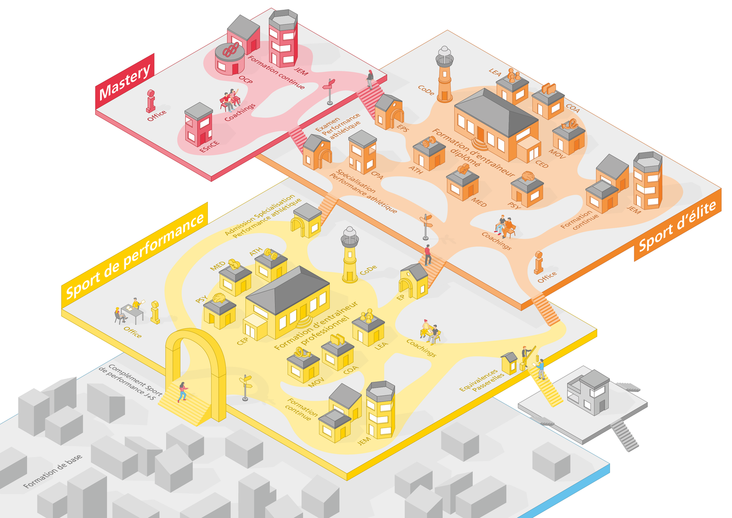 La structure de la formation et de la formation continue comporte deux échelons : sport de performance (qui succède à la formation J+S) et sport d'élite (qui succède au sport de performance).