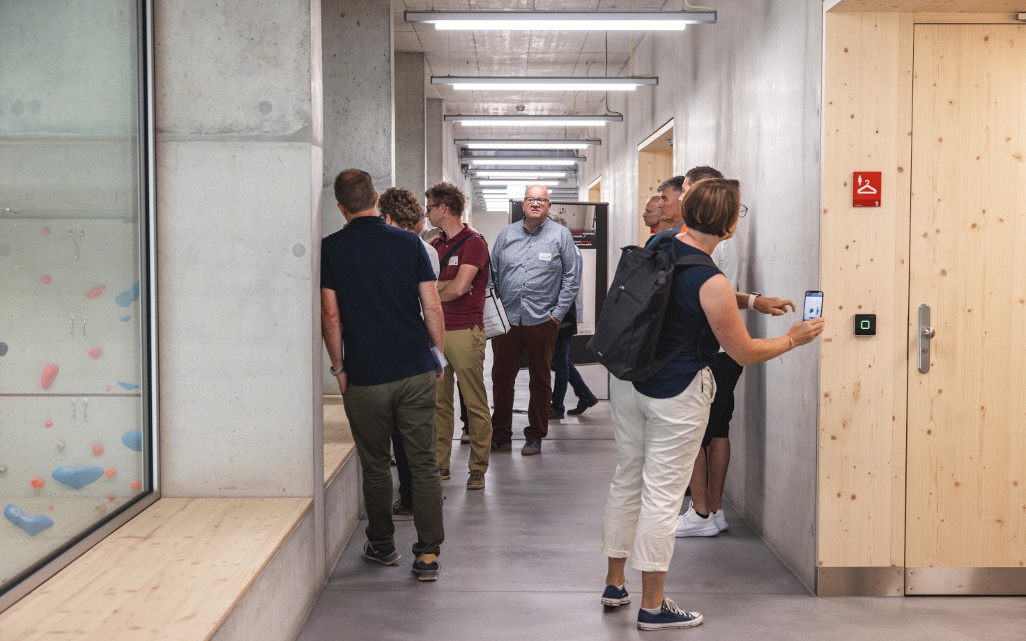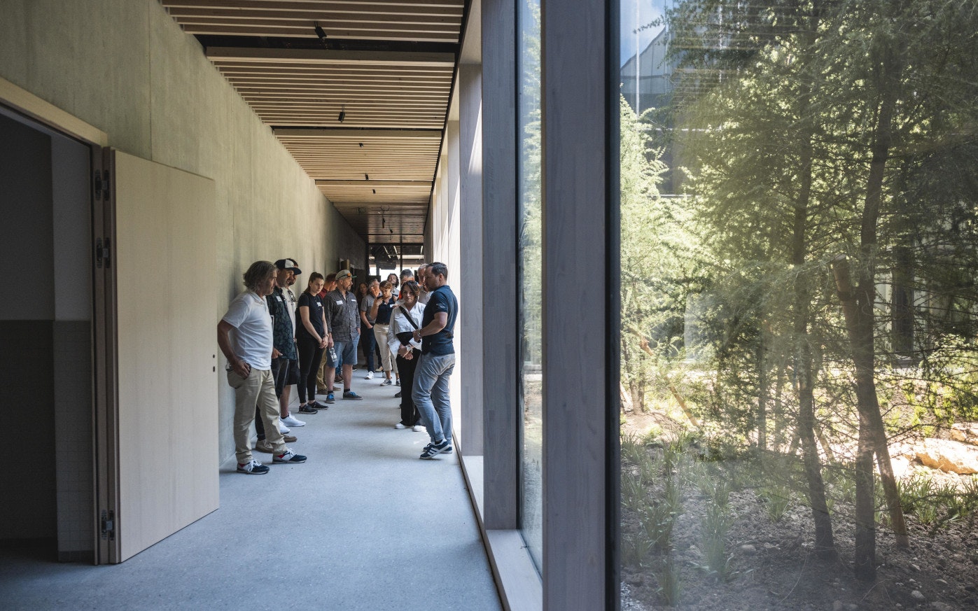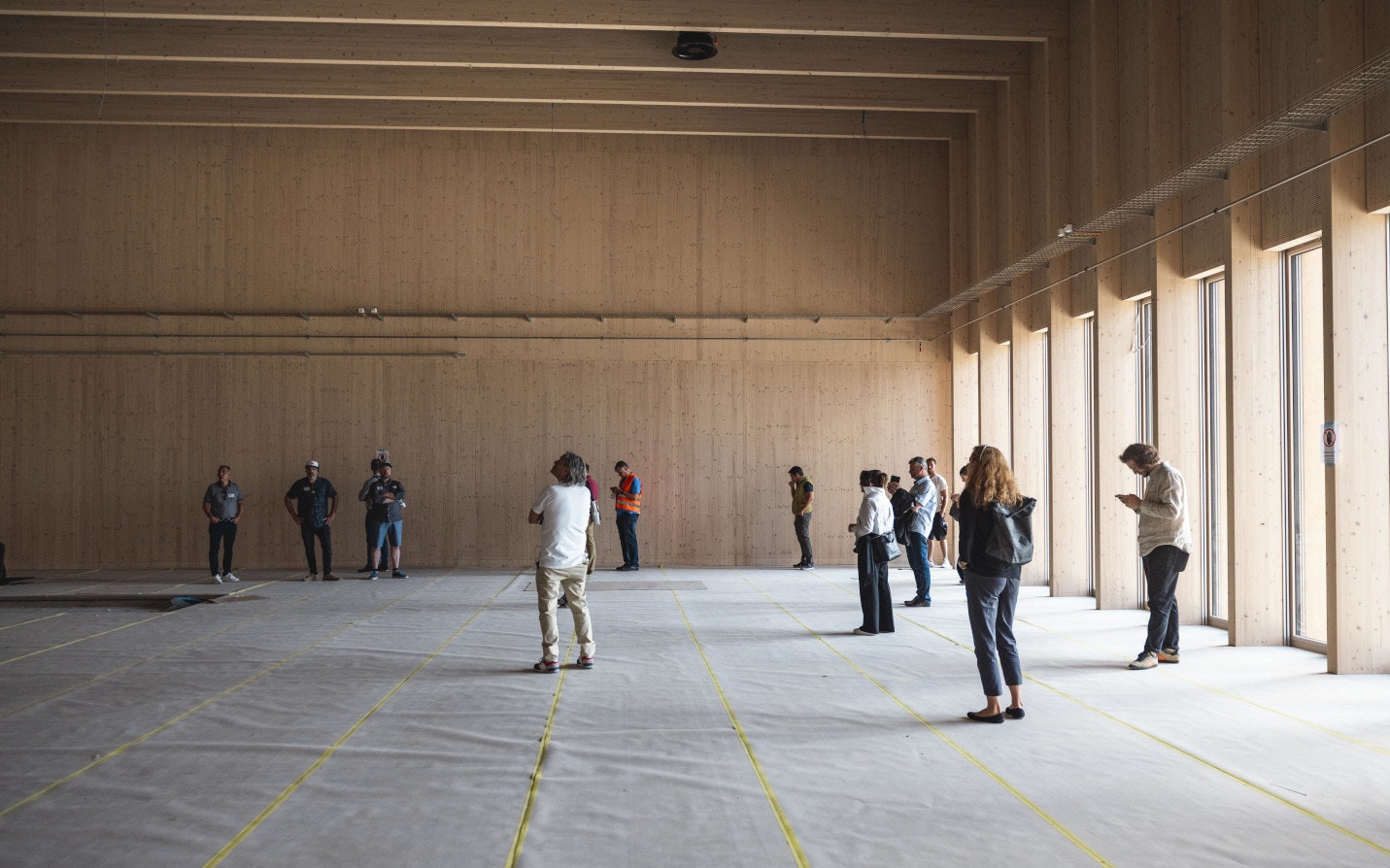 Le chantier de la Place des Mélèzes a constitué le point culminant de la visite des installations sportives. Le nouveau bâtiment conçu par le bureau argovien Kim Strebel Architekten et dont la mise en service est prévue pour le dernier trimestre 2023 se distingue par sa façade en bois, tout comme la salle de formation, ainsi que par son système de récupération d’eau, sa salle de mesure et son couloir, au sous-sol, comprenant une piste de mesure.