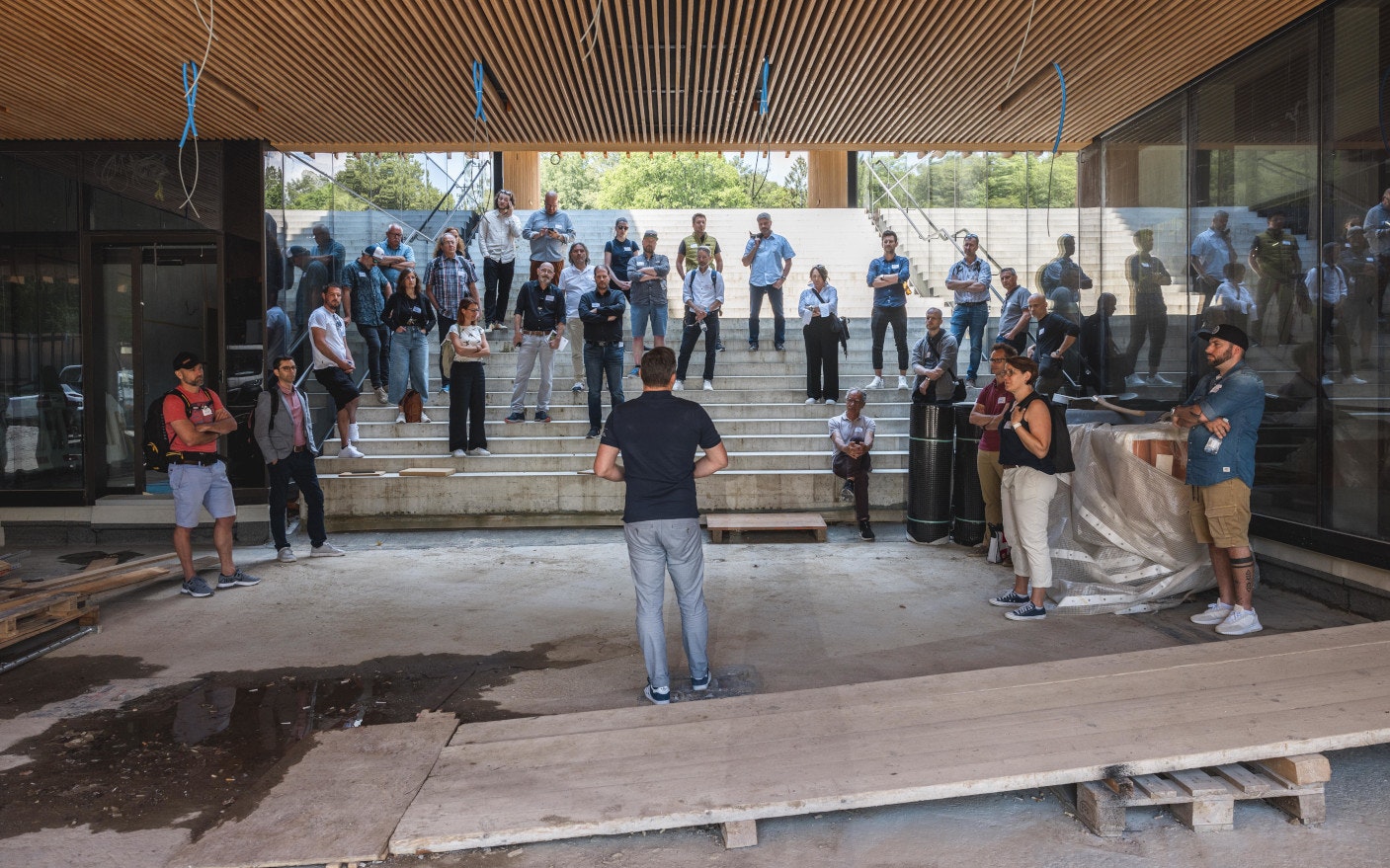 «C’est le genre de projets que l’on ne fait qu’une fois dans une carrière d’architecte», confiait Patrick Aumann de l’entreprise Aeby Aumann Emery Architectes. Le projet? La nouvelle salle de formation imposante, réalisée par le bureau fribourgeois, et son manteau de mélèze caractéristique qui émerge de la forêt de Macolin derrière la salle du Sport-Toto depuis octobre 2022.