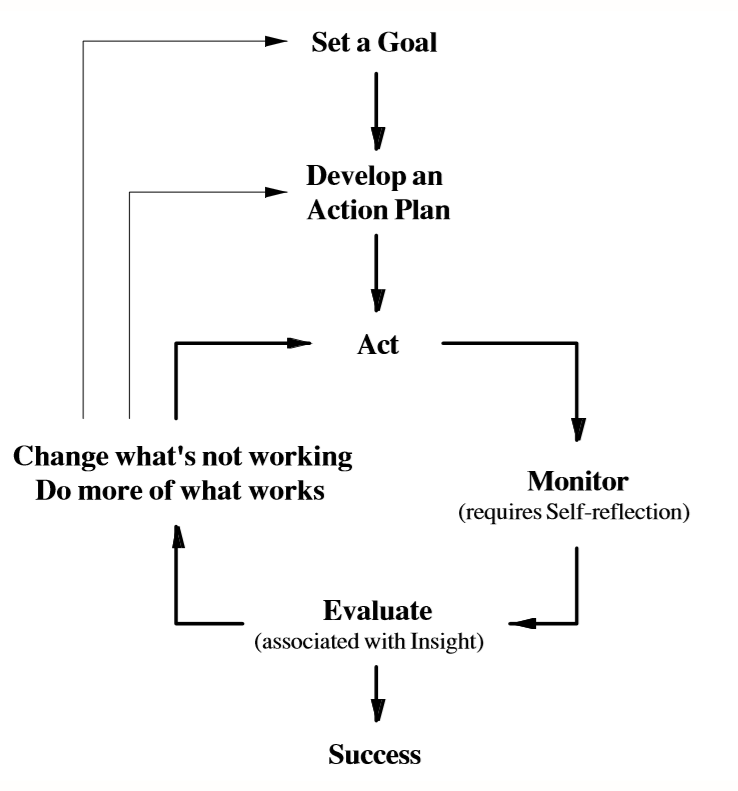 La pleine conscience constitue le fondement de l’autoréflexion. Plus largement, on peut dire que l’une et l’autre font partie du processus d’autorégulation (Grant, Franklin et Langford, 2002), un processus qui a pour but de gérer son propre changement. Dans ce schéma, on voit comment l’autorégulation et l‘autoréflexion s’articulent entre elles.